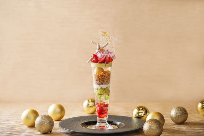 食べ進めるにつれて、甘味のあるイチゴ、アイスクリームとグランブルのサクサク感、甘酸っぱいキウイ、シャンパンジュレのゼリーと、味や食感の変化もお楽しみいただける逸品です。心躍るフェスティブシーズンをお楽しみください。