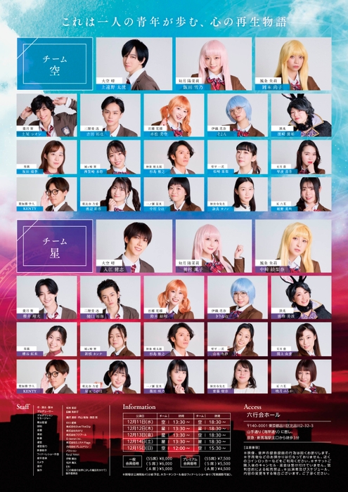 これまで数々のファンタジー(人間が登場しない)作品を生み出してきたS.I.P.H THEATERが、今回初の試みとなる人を主軸とした作品『この碧虚の世界に少しの魔法をかけて』を上演します。本作では、演劇要素を多く取り入れ、いつもと少し異なる世界観でS.I.P.Hらしいメッセージを、チーム空、チーム星の2チームに分かれ、豪華ダブルキャストで上演します。