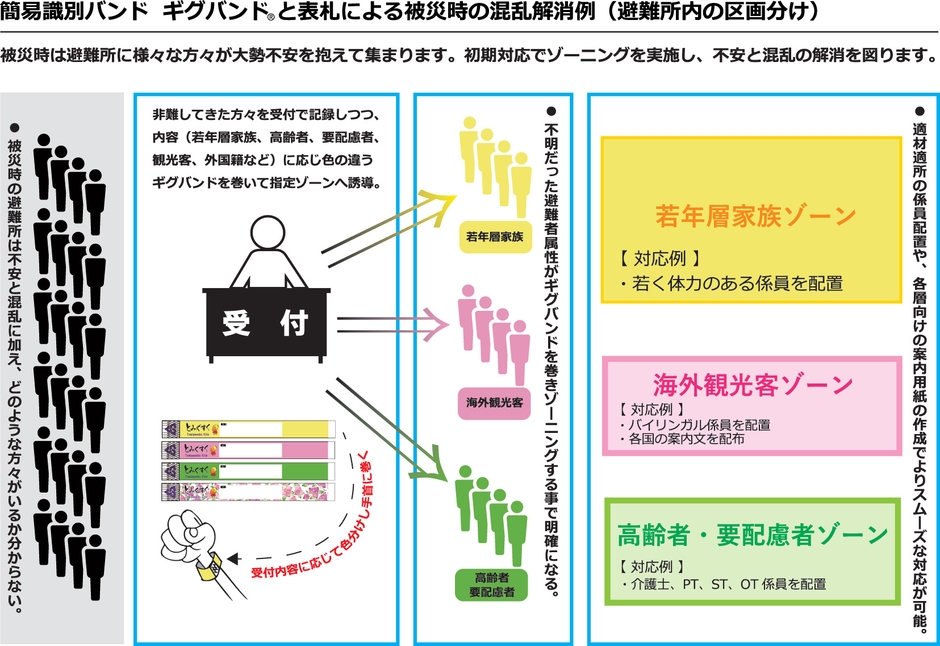 簡易型識別リストバンドを使用する事で、避難者がどの対象者なのか目視で判別でき、避難所内の区分けがしっかり行える事と、避難者への安心感の提供を与えている。