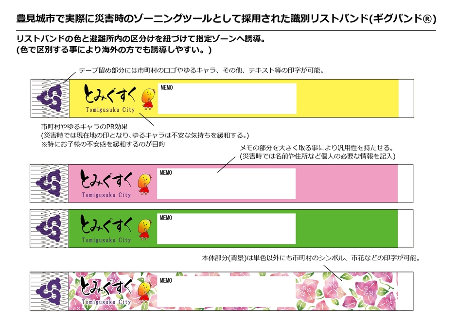 Withコロナ状況下における災害時の避難所内では、高齢者や基礎疾患を持つ避難者と、発熱のある者を明確に区画分けする必要がある。 近年増えている外国人観光客や要介助者など、様々な属性を持つ避難者がおり、リストバンドの色や、プリント柄によって避難所内のエリア分けを可視化し、目視で識別出来る事により、避難所内の運営をスムーズに行う事と、避難者の身元確認の有無及び、避難者への安心感の提供が出来る。