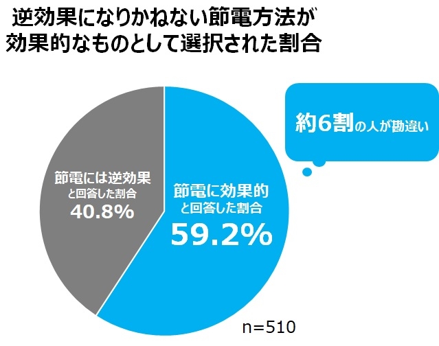 今回の調査では、効果的な節電方法と逆効果になりかねない方法をそれぞれ4つずつ挙げ、「夏場にエアコンを使う際、節電になると思うものはなんですか」と複数回答形式で尋ねました。その結果、効果的な節電方法が多く選ばれた一方で、約6割の人が逆効果になる方法を効果的なものとして選んでしまう結果となりました。逆効果になりかねないにもかかわらず効果的な節電方法として選ばれたものは、いわば“勘違い節電術”と言えるのではないでしょうか。