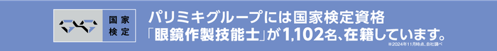 ■国家検定資格「眼鏡作製技能士」全国で1,102名の合格者が在籍2022年4月より、国の定める「技能検定」の職種に「眼鏡作製職種」が新設され、国家検定資格「眼鏡作製技能士」がスタートし、パリミキグループでは現在1,102名の合格者が在籍しています。(※2024年11月時点、自社調べ)多様化・高度化するお客様のニーズにあわせて、「適切な診断・治療」と「適切な眼鏡作製」の双方の実現に向け、眼鏡技術者が眼科専門医と連携しつつ、皆様により良い眼鏡を提供し、目の健康を守れるよう、眼鏡作製技能を高めてまいります。