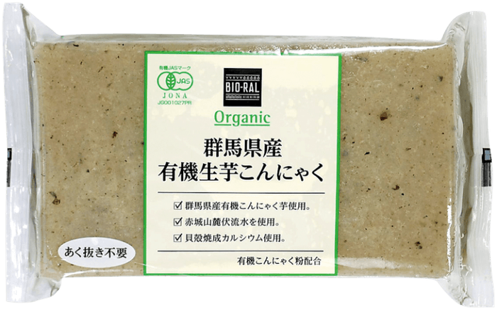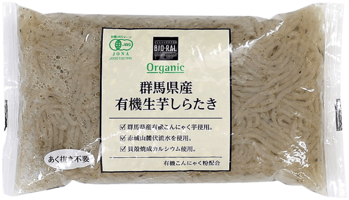 群馬県の赤城自然栽培組合の有機こんにゃく芋と、赤城山系伏流水を使用して作られたこだわりのしらたきとこんにゃく。ホタテ貝の貝殻から作った天然由来の凝固剤、焼成カルシウムを使用しています。