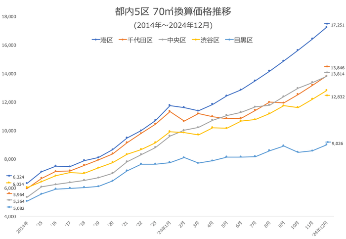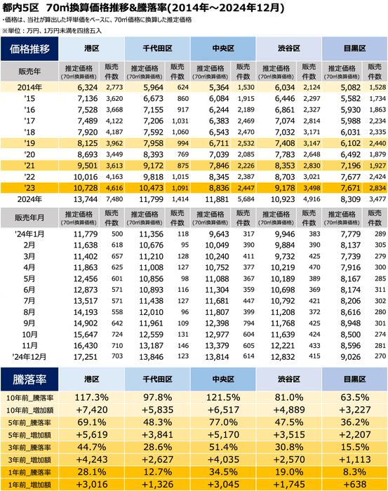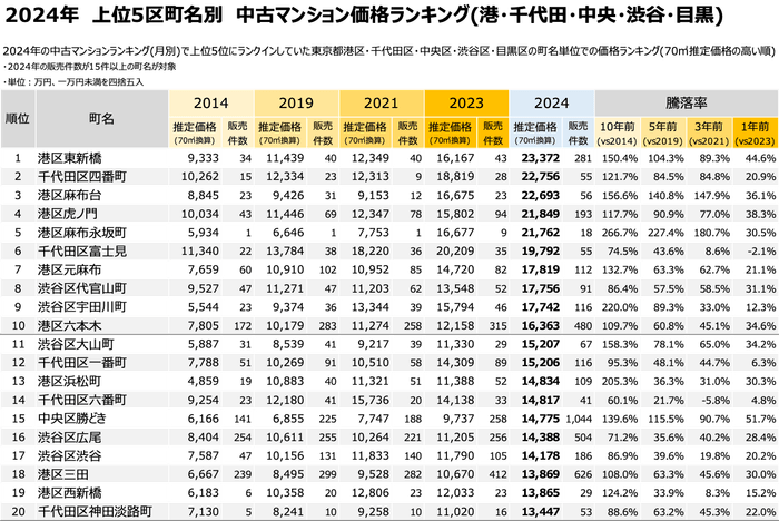 その第1弾として、2024年中古マンション価格ランキングにおいて、年間を通じて上位5位であった東京都港区・千代田区・中央区・目黒区・渋谷区の5区について深掘りし、10・5・3・1年前からの推移と町名単位での中古マンション価格推移を発表いたします。