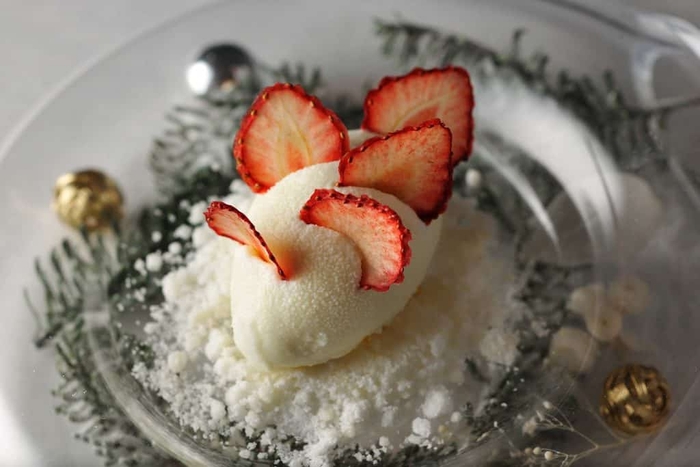 当リゾートで飼育する乳牛から搾った「トマム牛乳」を使用したジェラートをクリスマス仕様にアレンジしました。ジェラートの下には粉雪をイメージしたホワイトチョコのパウダーとイチゴを添え、クリスマスらしさを演出。乳牛は冬に体内の脂肪分が多くなるため、この時期特有の濃厚なミルクの味わいをホワイトチョコの風味とほのかなイチゴの香りとともに楽しめます。