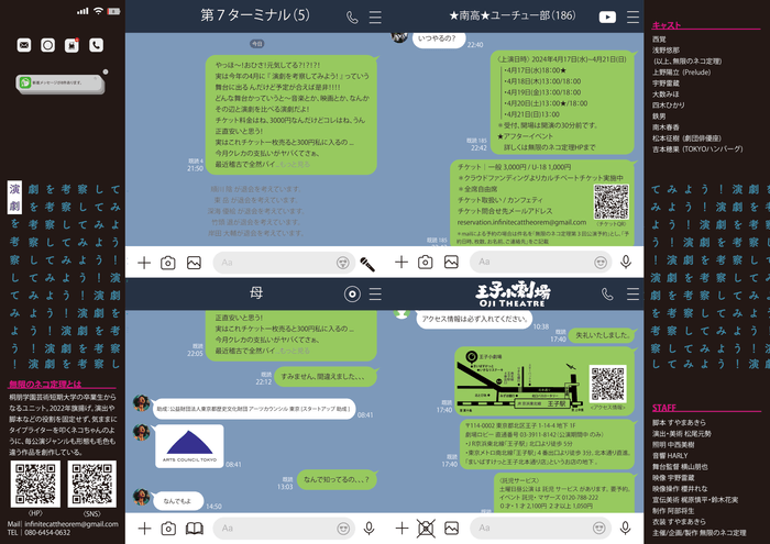無限のネコ定理(主宰:西覚)、無限のネコ定理第3回公演『演劇を考察してみよう!』が2024年4月17日 (水) ~2024年4月21日 (日)に王子小劇場(東京都北区王子1-14-4佐藤電機ビル王子佐藤ハイムB1F)にて上演されます。