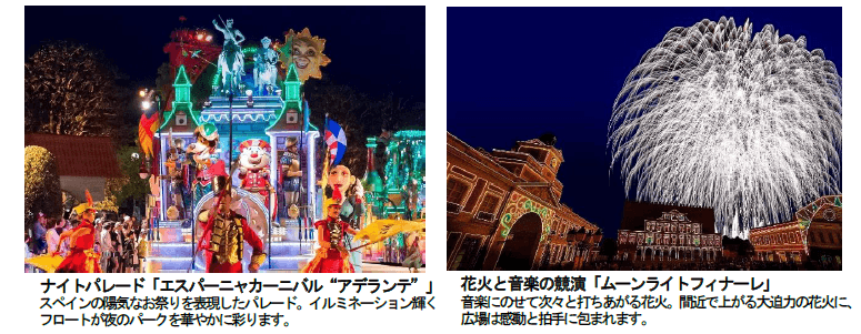 志摩スペイン村では、「スプリングフィエスタ」のフィナーレを飾る4 月29 日(木・祝)~5 月5 日(水・祝)の間、ナイター営業を実施いたします。きらびやかなナイトパレードや大迫力の花火が、夜のパークを華やかに彩ります。さらに、16 時以降お得に楽しめる「ムーンライトパスポート」を販売します。