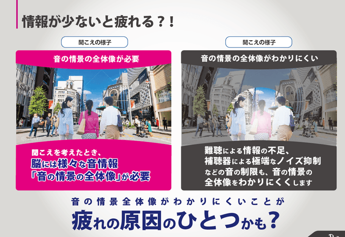 補聴器は言葉を聞き取るためのツールですが、音声情報以外の極端な音の制限などは、まわりの情報を少なくすることにつながり、その情報を脳が補おうとするためにかえって疲れの原因となっているとも考えられます。そこで私たちは、脳にバランスよく音の情報を届け、疲れにくく聞きとりやすい補聴器のご提案とご試聴・体験方法の両方が必要と考えました。