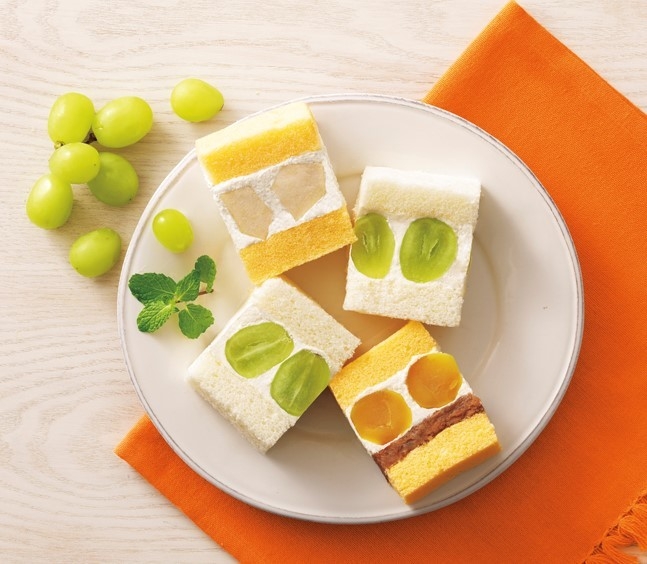 秋の味覚「栗」、「シャインマスカット」、「ラ・フランス」を山形県産ブランド米つや姫の米粉を使ったふわふわかすてらと蔵王地養卵のスポンジで挟んだフルーツサンド。