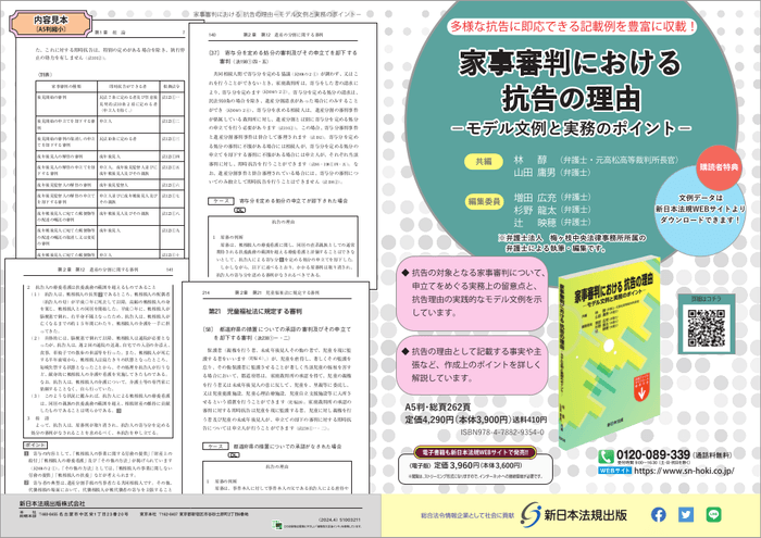 新日本法規出版株式会社(所在地:愛知県名古屋市中区栄1丁目23番20号、代表取締役:星謙一郎 (https://www.sn-hoki.co.jp/))は、【ご購読者専用ダウンロードサービス】付書籍「家事審判における 抗告の理由-モデル文例と実務のポイント-」を2024年5月20日に発売いたしました!