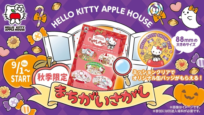 内容: 施設内の360度シアターに映し出されたハローキティの可愛いイラストと、まちがいさがしキットを照らし 合わせ、隠された間違いを全て見つけるとHELLO KITTY APPLE HOUSE秋限定デザインの缶バッジをプレゼント