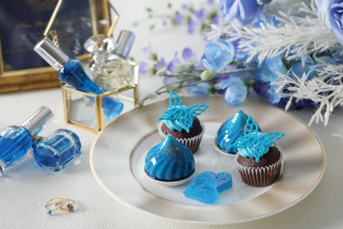 ・スタンド: (上段)ヨーグルトとカルピスのヴェリーヌ/ミニコーン(中段)ライチのガトーオペラ/ココナッツのブランマンジェ バタフライピージュレ(下段)琥珀糖/レアチーズとブルーベリーのムース/チョコミントマフィン