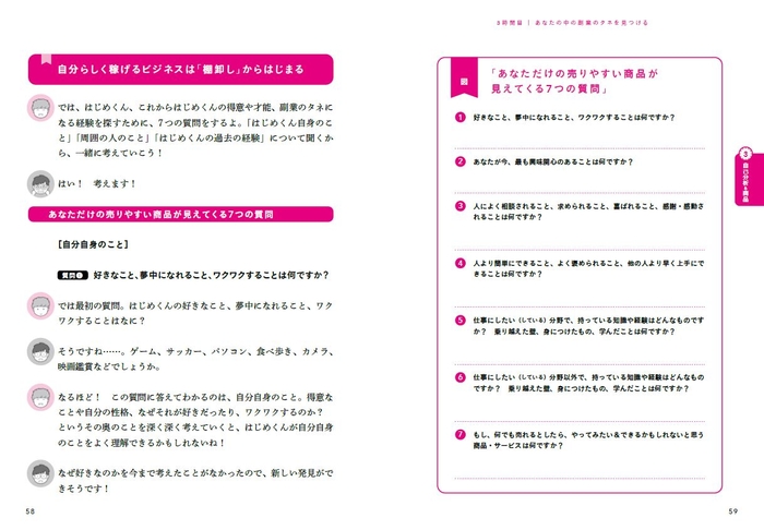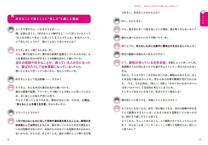 「副業素人のはじめくん」と「褒め上手な宮中先生」の会話形式で進むので、普段あまり本を読まない方も、副業の知識がゼロという方も、サクサク読み進められること間違いなし。