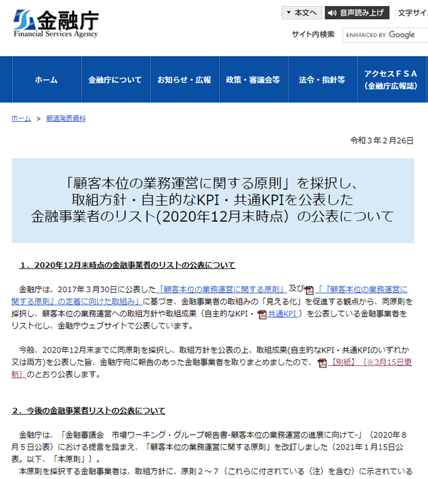 「顧客本位の業務運営に関する原則」を採択し、取組方針・自主的なKPI・共通KPIを公表した金融事業者のリスト(令和2年9月末時点)の公表について(金融庁Webサイト)
