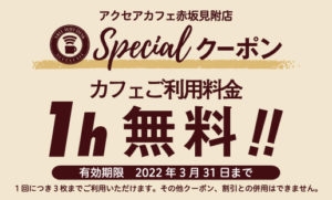 アクセアカフェ赤坂見附店のオープンを記念して1時間無料クーポンを配布いたします。