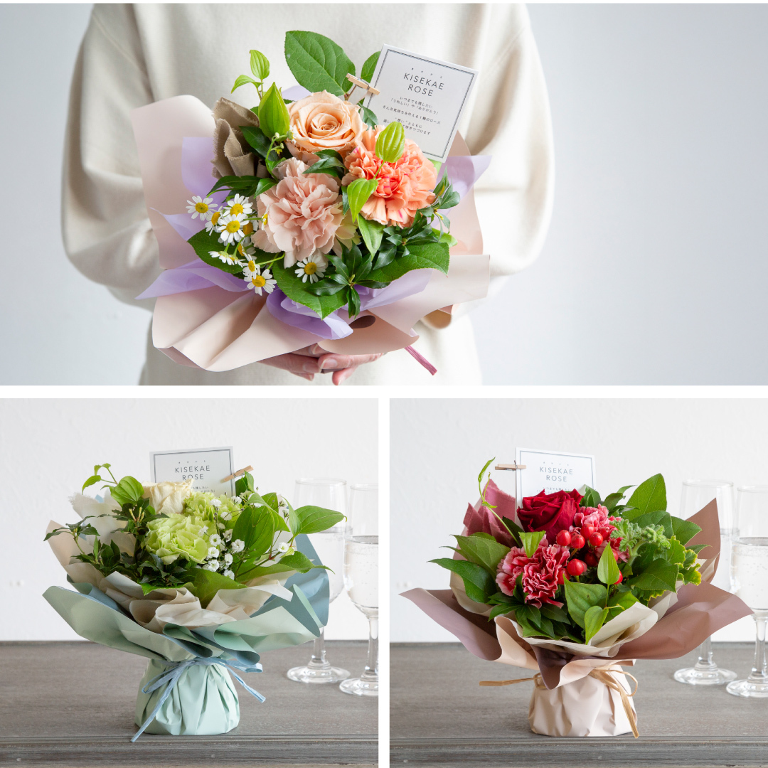 瓶いらず!水換え不要!届いた状態のまま飾れます。ラッピングの中にはお花に必要な栄養と抗菌剤を含んだ保水ゼリーが入っているので、ラッピングそのままで水やり不要。そのまま飾れる生花の花束としてお楽しみいただけます。
