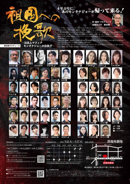 劇団夜想会 野伏翔プロデュース『祖国への挽歌』~日系人マフィア モンタナ・ジョーの伝説!!~が2023年9月12日 (火) ~2023年9月17日 (日)に俳優座劇場(東京都港区六本木4-9-2 )にて上演されます。