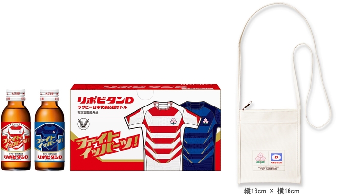 今年も日本とニュージーランド両代表チーム、ラグビー界全体を盛り上げるため、例年好評の「リポビタンD ラグビー日本代表応援ボトル」と「リポビタンD ラグビーオールブラックス応援ボトル」を大正製薬ダイレクト、大正製薬ダイレクト楽天市場店、大正製薬ダイレクトAmazon店で発売いたします。2024年版の日本代表応援ボトルは、日本代表のファーストジャージーとセカンドジャージーをラベル全体にデザインしました。オールブラックス応援ボトルは、ニュージーランド代表のファーストジャージーとセカンドジャージーのカラーをベースに国花のシルバー・ファーンのエンブレムを全面にプリントしたラベルデザインとし、各30本セットを数量限定でご用意しています。また、ノベルティとして「リポビタンD ラグビー日本代表応援ボトル」には、桜のエンブレムとリポビタンDロゴ入りの白のサコッシュ、「リポビタンD ラグビーオールブラックス応援ボトル」には、シルバー・ファーンのエンブレム入りの黒のサコッシュが付いています。