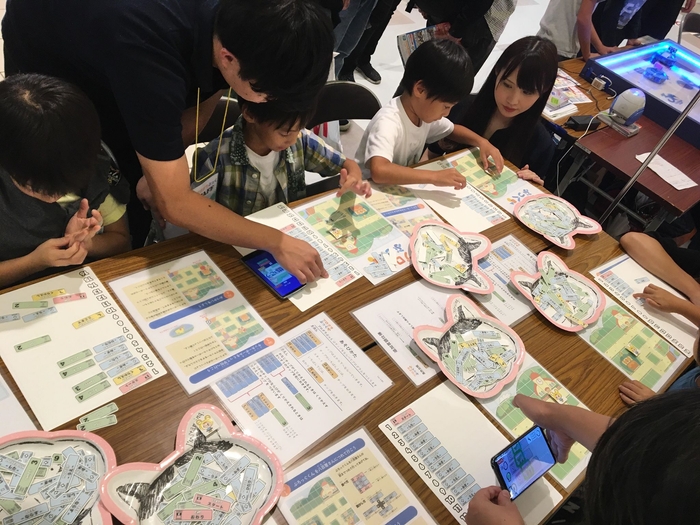 「プログラぶっく」は、紙製のカード型プログラムを並べて画面の中のキャラクターを操作する、すごろく遊びのようなゲームブック型のプログラミング学習教材です。無料体験版ではこのカードと台紙をPDFで配布、お手元のスマートフォンやタブレットに専用アプリをダウンロードすることで、実際にキャラクターを動かして遊ぶことが可能です。