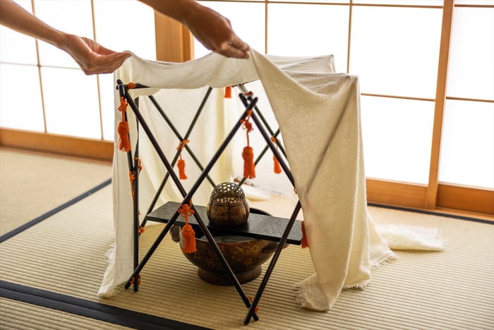 調合した練香は、香炉に入れて客室に香りを漂わせたり、伏籠(ふせご)を使って衣服や寝具に香りをまとわせたりすることができます。伏籠とは、香炉や火鉢の上に逆さに伏せておく籠(かご)のことで*7、平安貴族は着物に香りをうつすために使っていました。洋服や寝具だけでなく便箋に香りをうつすことができるので、旅先から言葉とともに香りを送ることもできます。