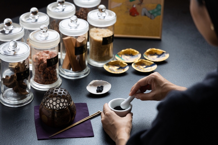 星のや京都が位置する嵐山は平安時代から貴族の別荘地として栄え、冬には水墨画のようなしんとした静けさを楽しむことができる風光明媚(ふうこうめいび)な場所です。源氏物語には、公私ともにのんびりする冬に薫物合わせ*2で香りに興じていたという描写があります*3。澄んだ空気が流れる冬の静かな嵐山で香りにつつまれることで、せわしない日常を忘れてゆったり過ごしてほしいと考えました。