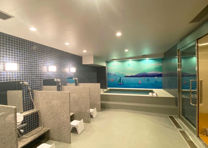 お風呂アートが飾られた大浴場もあり、宿泊のお客様はお部屋のシャワーだけでなくこちらの大浴場も利用できます。