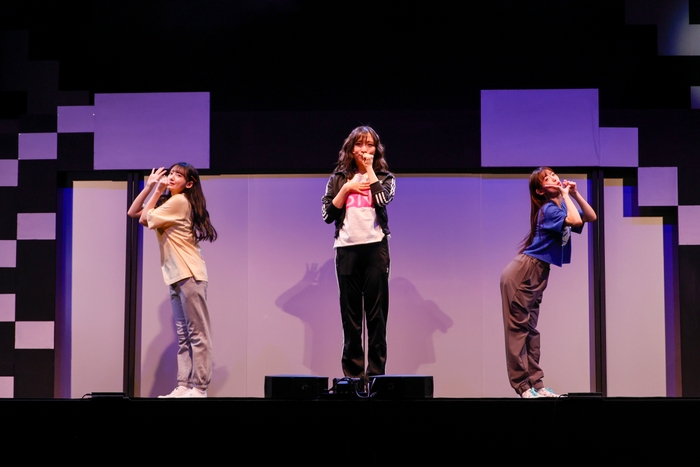 ゲネプロ後、囲み取材に小栗有以、濱岸ひより、鈴木瞳美が応じた。小栗は「二階堂ルイはアイドルを目指す女の子なんですけど、クールで真面目で周りを寄せ付けず、ツンケンしています。でも、お笑い芸人の馬場さんやミステリーキッスのメンバーと仲良くなって、段々と可愛さが見えてきます。実は弱いところもあったりするんですけど、今回の舞台はミステリーキッスがメインなので、二階堂の可愛らしさが詰まった舞台になってるんじゃないかなって思います」と演じる役に絡めた見どころを語った。そして、「これまでに『マジムリ学園』とかグループ内の舞台は出たことがあったんですけど、(グループ)外の舞台は今回が初めてです。この舞台を通して、新しい学びがありつつ、共演者の皆さんとも仲良くなれて、私的にも、二階堂的にも大きな舞台になっています」と、共演者から刺激を受けたと話した。