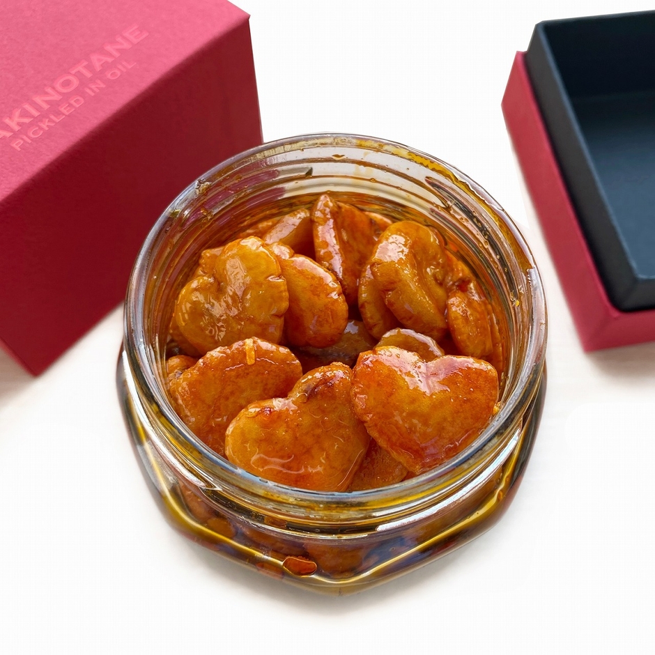 甘い物が苦手なあの人に 「ハート型柿の種のオイル漬け にんにくラー油」 数量限定で再発売