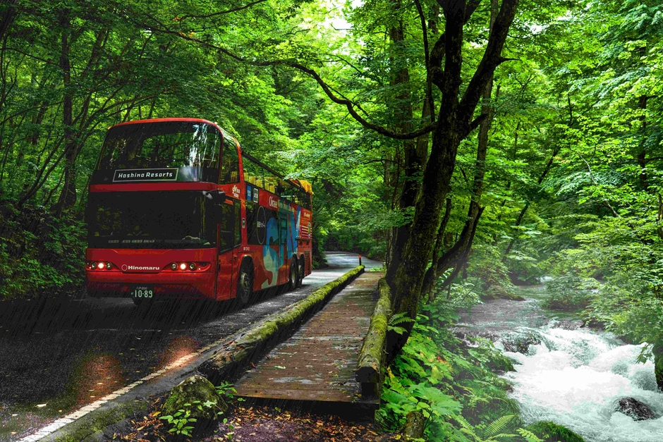 渓流沿いに建つ唯一のリゾートホテル「奥入瀬渓流ホテル」は、2021年6月25日~7月25日まで、雨に濡れた美しい奥入瀬渓流沿いの自然を楽しむ「雨の絶景渓流オープンバスツアー」を実施します。オープンエアの2階建てバスに乗り、雨の潤いできらめく森と渓流の美しい景色や、雨の日にしか感じられないにおいを存分に楽しめます。また、ツアーを満喫できる防水、防寒グッズも用意しています。レインコート、タオルセットのほか、レインハット、携帯の防水カバー、湯たんぽなどのサポートアイテムも揃っています。