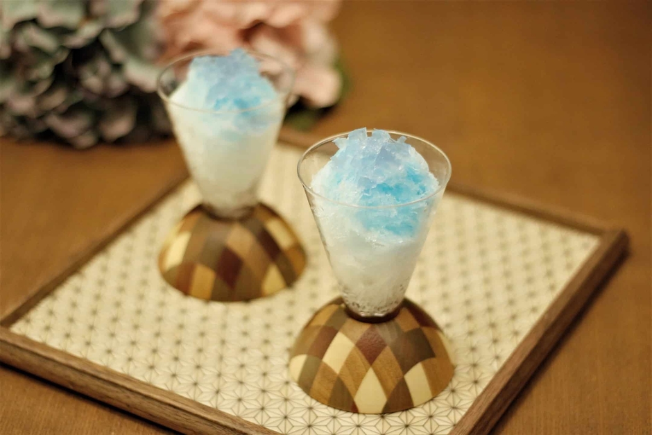 茶室であじさいの和菓子とあじさいかき氷を提供