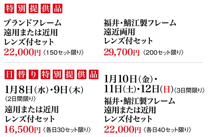 ※サングラスを除きすべてフレーム+レンズのセット価格です。※価格は消費税を含む総額にて表示しております。※いずれも数に限りがございますので売り切れの際はご容赦ください。