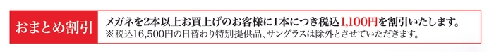 期間中、会場内のフレーム+レンズ付セットを2本以上お買い上げのお客様に1本につき税込1,100円を割引いたします。