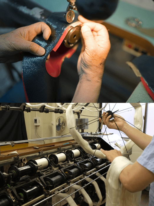 AYAMEの靴を作る当社の、この道65年の靴職人、酒井も若い頃の靴造りでは絹糸を使っていたとのことです。その後、絹糸よりも強度の出るポリエステル糸が登場し次第にポリエステル糸しか使わなくなって行ったとのことです。世界の近代化の中で工業的に安定して石油から生産できる糸が主役となりましたが、今後の地球環境や循環型の社会構造の構築へ向けて再び絹糸も注目を集めるようになってきました。