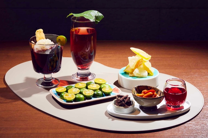 バーカウンターにはヒパーチやシークヮーサーなど、沖縄に馴染みの深い食材を使用した、5種類のシーズニングを用意します。それぞれの食材に関する説明やオススメの組み合わせは、バーカウンターに立つスタッフが案内。沖縄の食材を加えて、オリジナルのドリンクを味わうことができます。