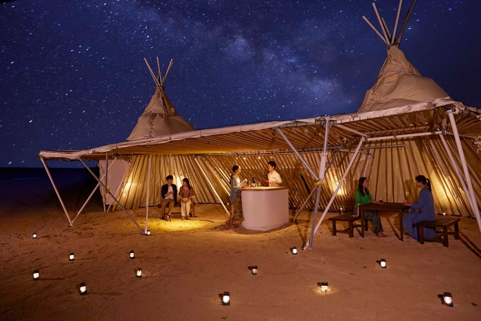 ホテルに隣接するビーチに、大きなティピとバーカウンターが登場します。大きなティピは、心地の良い波の音や潮風に包まれながら、お酒を嗜むことができる空間です。真っ暗なビーチに煌々と輝く大きなティピが、南の島ならではの非日常な雰囲気を演出します。