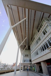 沖縄県那覇市に昨年完成した旭橋駅は、モノレールの駅です。駅に直結するリーガロイヤルホテルやバスターミナル、さらには那覇埠頭も近く交通の重要な拠点です。労金ビルとホテルの間にかけた大きな屋根の化粧材にスパンドレルが使われております。今回の納入事例はこのスパンドレルが対象商品です。