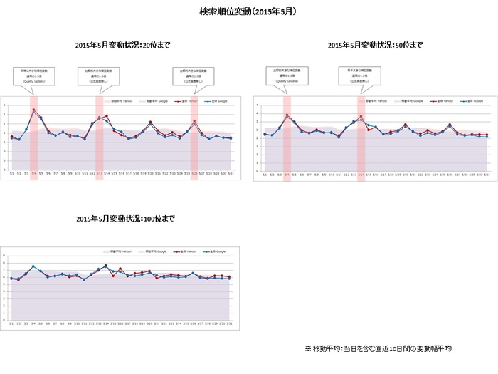 重要度の高いトピックが立て続けに発表された2015年5月の順位変動は、1位から100位では安定していましたが、上位20位以内では比較的大きな順位変動が複数回確認されました。