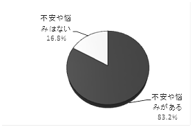 自分や家族の問題として抱えている悩みがあるかを、16のジャンル(SDGsのゴール)の内容をもとに独自に設定した48項目の中から選んでもらったところ、83.2%の人は1つ以上の悩みを抱えており、回答者1人あたりでは3.36個の悩みを抱えているという結果になった。なお、「不安や悩みはない」と答えた人は16.8%だった(数字は47都道府県ごとの結果の平均)。