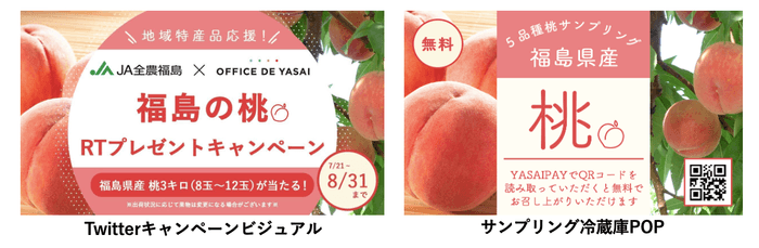 株式会社KOMPEITO(東京都渋谷区、代表取締役 渡邉瞬)が展開する“置くだけ健康社食”「OFFICE DE YASAI (オフィスで野菜)」は、全国の地方自治体や各地のJA 、JA全農と連携し、「OFFICE DE YASAI」専用冷蔵庫や専用アプリ「YASAI PAY(ヤサイペイ)」にて、地方の特産品の販売や、無料サンプリングを行う地方応援企画を月替りで実施しております。今回は、7月から9月にかけて、福島県産 桃のオフィスサンプリングとTwitterキャンペーンを実施しております。