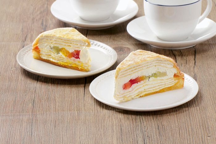 “ミルクレープ”とは、薄いクレープ生地の間にクリームや果物などを交互に挟み、幾層にも重なった断面が目を引くケーキです。5種のフルーツ(マンゴーダイス・温州みかんジャム・白桃ダイス・いちごジャム・キウイソース)を使用し、北海道産生クリームのほのかな甘味とフルーツの酸味のバランスが絶妙です。