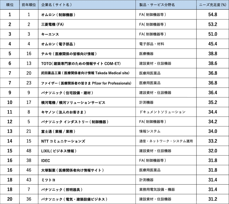 BtoBサイト調査のランキング指標であるニーズ充足度(ターゲット(該当する製品・サービスの購入関与者)に占めるサイトでのニーズ充足者の割合)は、オムロン(制御機器)が54.8%で16年連続トップとなりました。次いで三菱電機(FA)が53.2%、キーエンスが51.0%とFA(制御機器等)分野のサイトが上位に並びました【表1】。