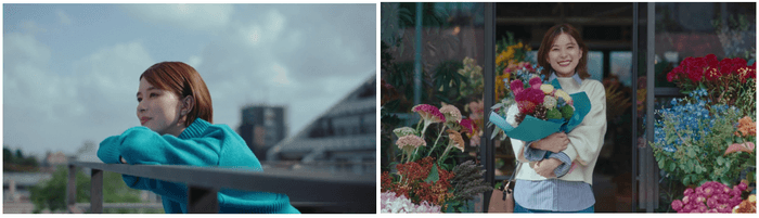 社会人の芳根さんは毎日仕事で大忙し。友達と遊びに出かける時間も取れず、浮かない表情を見せます。そんな中、気分を一新すべく新しい服を購入。袋から鮮やかなブルーのニットを取り出し、着てみると、暗かった表情がはじけるような笑顔に一変します。ピンクのニットを着て軽やかな足取りで街に飛び出し、ショーウィンドウに映る自身の姿を見て嬉しそうに微笑んだり、赤のニットを着て友達と写真を撮ったり、キナリのニットを着てバスに乗り、初めてのバス停で降りてみたことで素敵なお花屋さんを見つけたり。お気に入りの服に出会ったことで、芳根さんの日常もカラフルに色づいていきます。最後には、愛犬とおそろいのブルーのニットを着てお散歩へ。好きな服・好きな色を身にまとうことで、何気ない日常がきらめいていく様子を描いています。