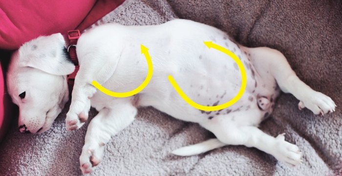 愛犬を仰向けにさせて、右回りで円を描くようにお腹を軽く撫でてあげましょう。胸の部分も同じようにマッサージをしてあげてください!