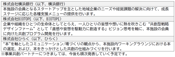 また、本施設は、横浜エリアにおける事業共創による社会課題解決のための複合施設となることを目指し、下記のパートナーと協業することが決定いたしましたのでお知らせします。