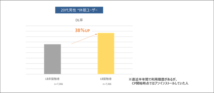 休眠ユーザーに限定すると、広告接触によりダウンロード率は38%アップ。