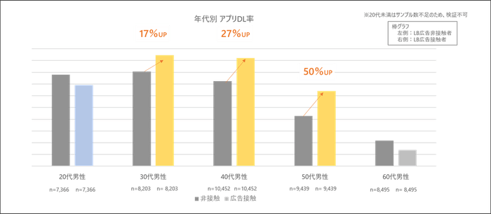 50代男性においては、非接触者と比較し広告接触者のダウンロード率は50%のアップ。