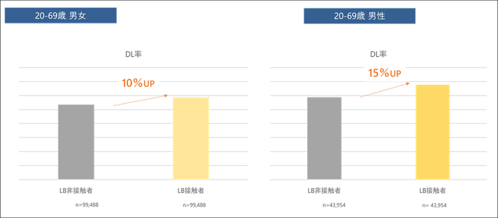 広告接触者全体では、非接触者と比較しダウンロード率が10%アップ。今回のターゲットであった男性に絞ると、15%のアップが確認出来た。