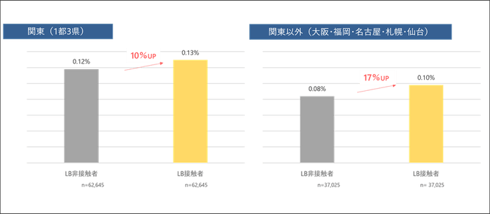 デジタルサイネージの配信エリアを関東と関東以外、に分けて分析。いずれにおいても広告接触によるダウンロード率のアップが見られたが、特に関東以外においてその効果が大きかった。