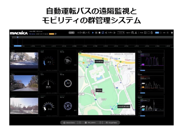 車両に取り付けられたセンサー(GPS、カメラ等)と車両のCAN情報(車速、回転数、ステアリング舵角等)を収集し、高品質な伝送方式を用いてクラウドへデータを保存することで、1人で複数台の車両を遠隔から監視者がクラウドにアクセスし、リアルタイムでモビリティの状況確認ができます。その他、蓄積されたデータから過去の状況確認、データ分析、AI活用にも応用活用できます。