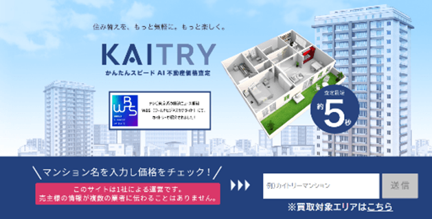 AI査定プラットフォーム「KAITRY(カイトリー)」を利用した場合、マンション名を入力し、「広さ(例えば65㎡)」「間取り(例えば3LDK)」「階数(例えば4階)」を入力すると最短5秒で買取参考価格が表示されます。